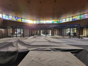 Die Heizung ist demontiert, vom Bauunternehmen sind sehr viele Durchbrüche erstellt worden und die Stahlkonstruktion für den Versammlungsraum ist aufgestellt.