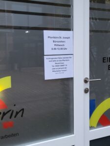 Das Pfarrbüro befindet sich übergangsweise in der Kirchstraße, Hausnr. 6, in dem Gebäude der Familie Kerperin.